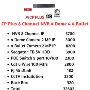 | Including itmes | 2mp IP cp plus 4 dome and 4 bullet cameras, 8 ch Nvr , 8 Ch Poe Switch, 1 TB HDD , 100mtr Cat-6 wire , 14 RJ-45 connectors. |